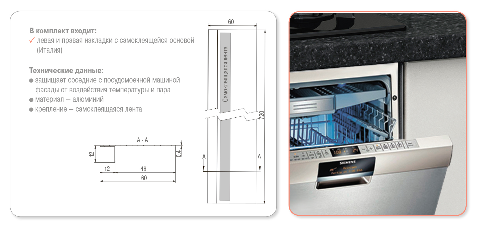 Защитные накладки Л+П, L72см, д/встр.посуд.машины, алюминий