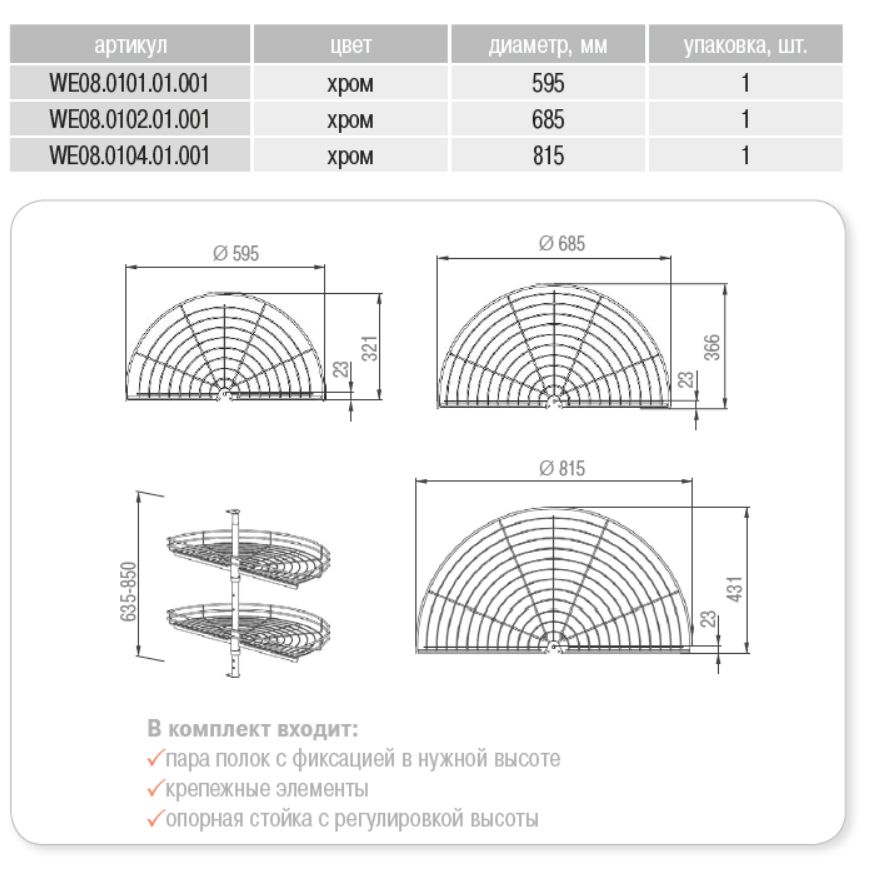 Бренд REJS (Польша) Цвет Хром Ширина шкафа, мм 850 Материал Металл В комплект входит Пара полок с фиксацией в нужной высоте,крепежные элементы,опорная стойка с регулировкой высоты. Страна ПОЛЬША Вес нетто 4.782 -