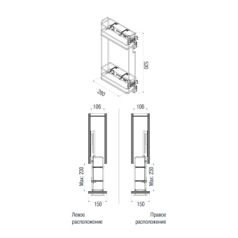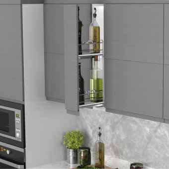 2х-ур. реш.емкость 150мм левая в верх.шкаф L300мм,напр.Blum, дно-ЛДСП, креп/фас.,разд/бут., хром