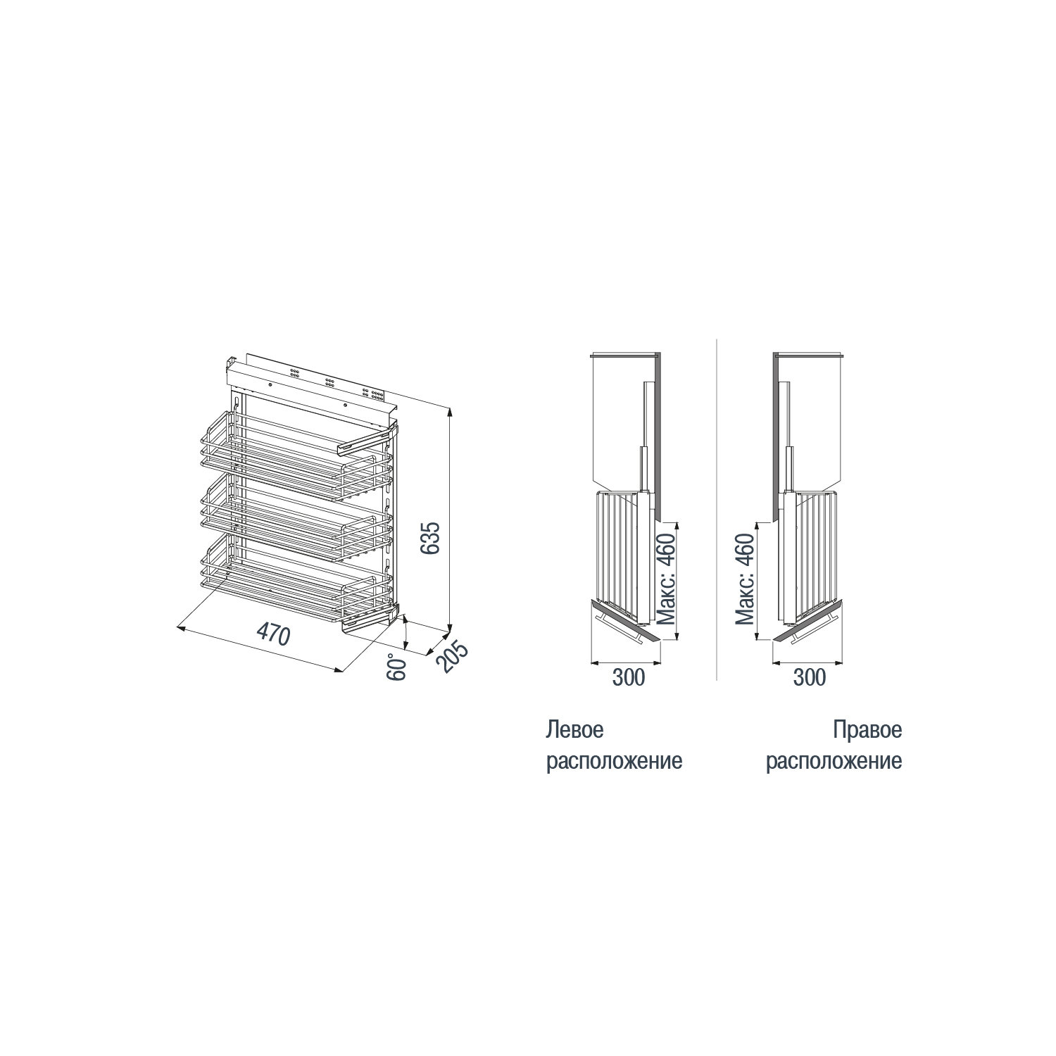 3х-ур. реш.емкость 45˚ правая, 300мм H635мм на ЛЕВЫХ направл. с аморт., хром