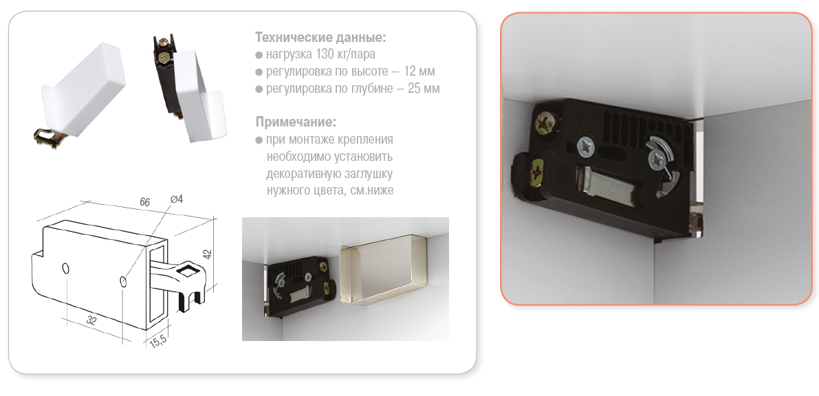 Бренд EuroOrvel (Италия) Цвет Черный Технические данные Нагрузка 130 кг/пара. Регулировка по высоте – 12 мм. Регулировка по глубине – 25 мм. Примечание При монтаже крепления необходимо установить декоративную заглушку нужного цвета. Нагрузка 130 кг/пара Страна ИТАЛИЯ Вес нетто 0.0566