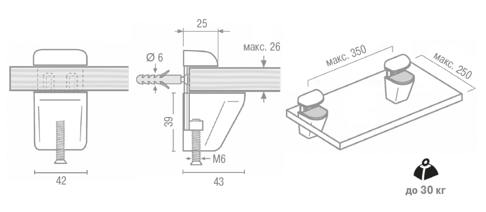 Менсолодержатель для деревянных и стеклянных полок 3-26мм, матовый хром