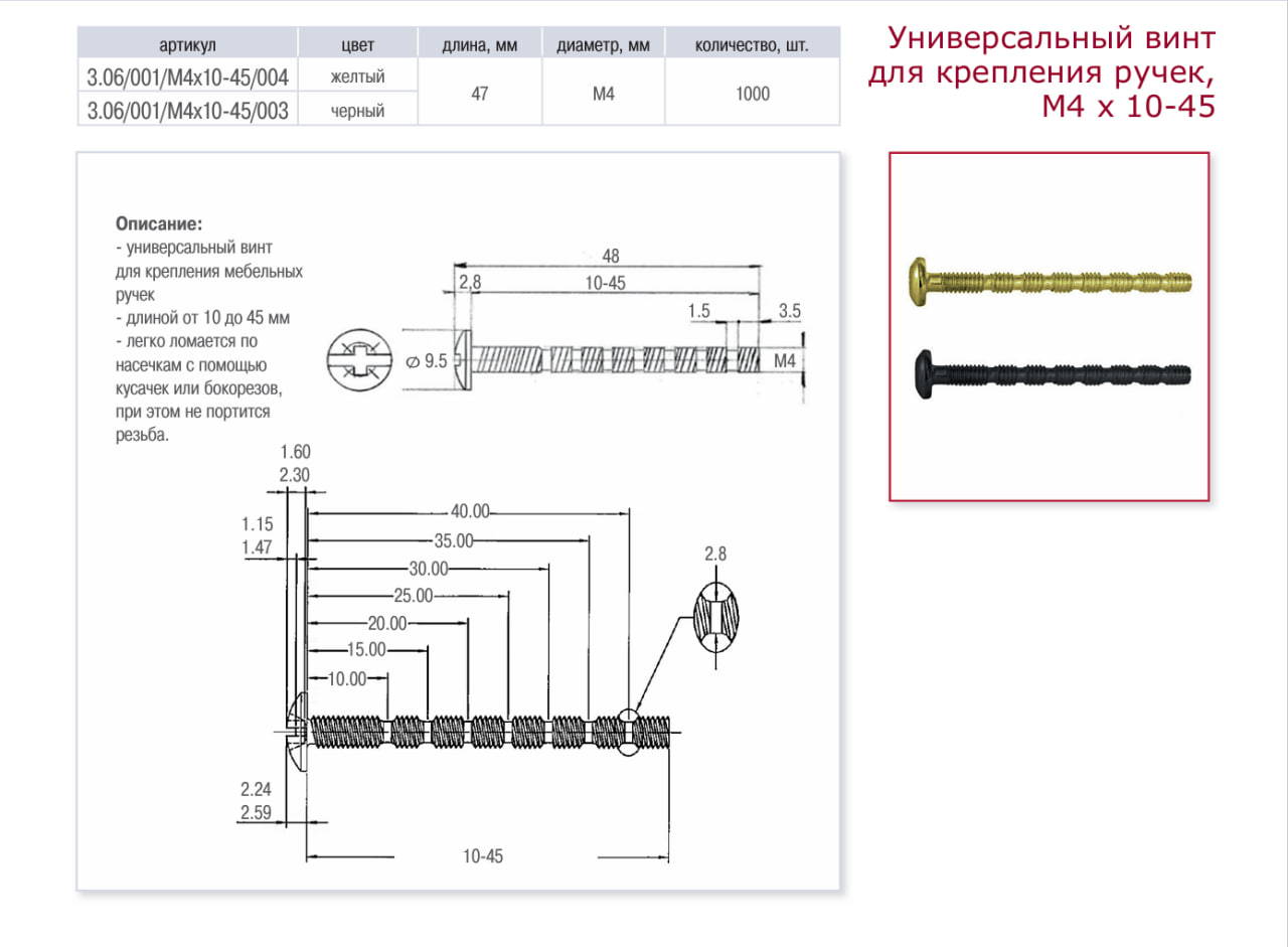 Универсальный винт д/крепл. ручки M4x10-45, латунь