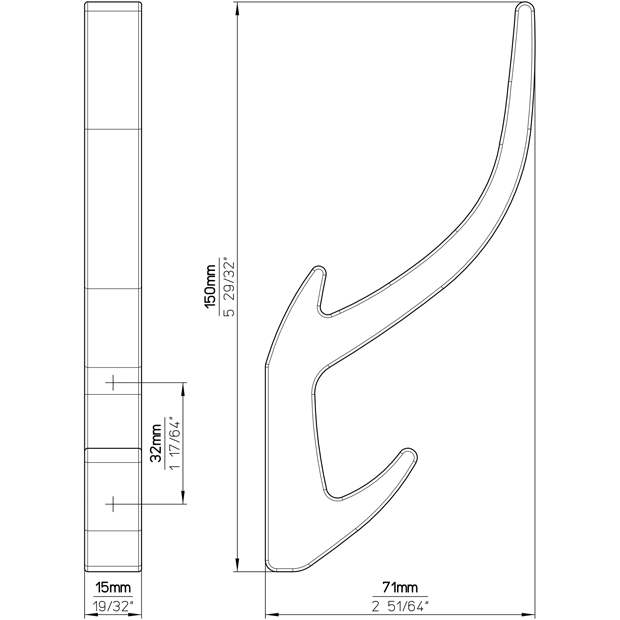 Крючок двухрожковый 150х15х71мм, полированный никель