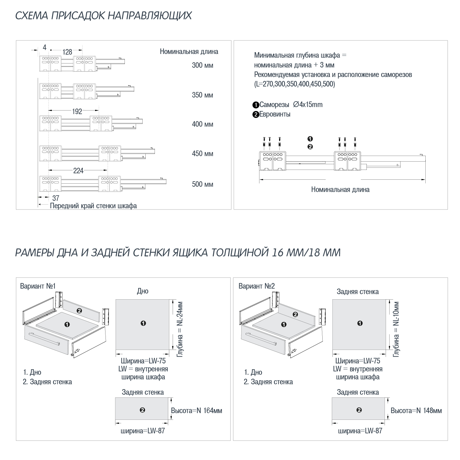 | Технические данные | - Максимальная нагрузка 40 кг - Полное выдвижение - Мягкое закрытие |