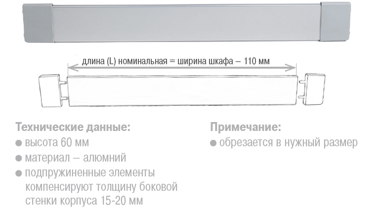 Бренд Grass GmbH (Австрия) Цвет Серый металлик Технические данные Высота 60 мм. Материал — аллюминий. Подпружиненные элементы компенсируют толщину боковой стенки корпуса 15-20 мм. Примечание Обрезается в нужный размер. Страна АВСТРИЯ Вес нетто 0.33