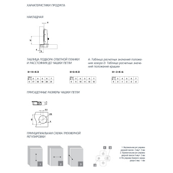 Бренд REGGAR В комплект входит - Петля со встроенным амортизатором - Ответная планка Технические данные - Используется для накладных фасадов; - Угол открытия 105гр; - Для фасадов толщиной15-20 мм; - Глубина чашки 11,5 мм; - 3D-регулировки фасада; - Полностью металлическая конструкция; Крепление чашки Саморезы Страна КИТАЙ Амортизатор + Вес нетто 0.0896