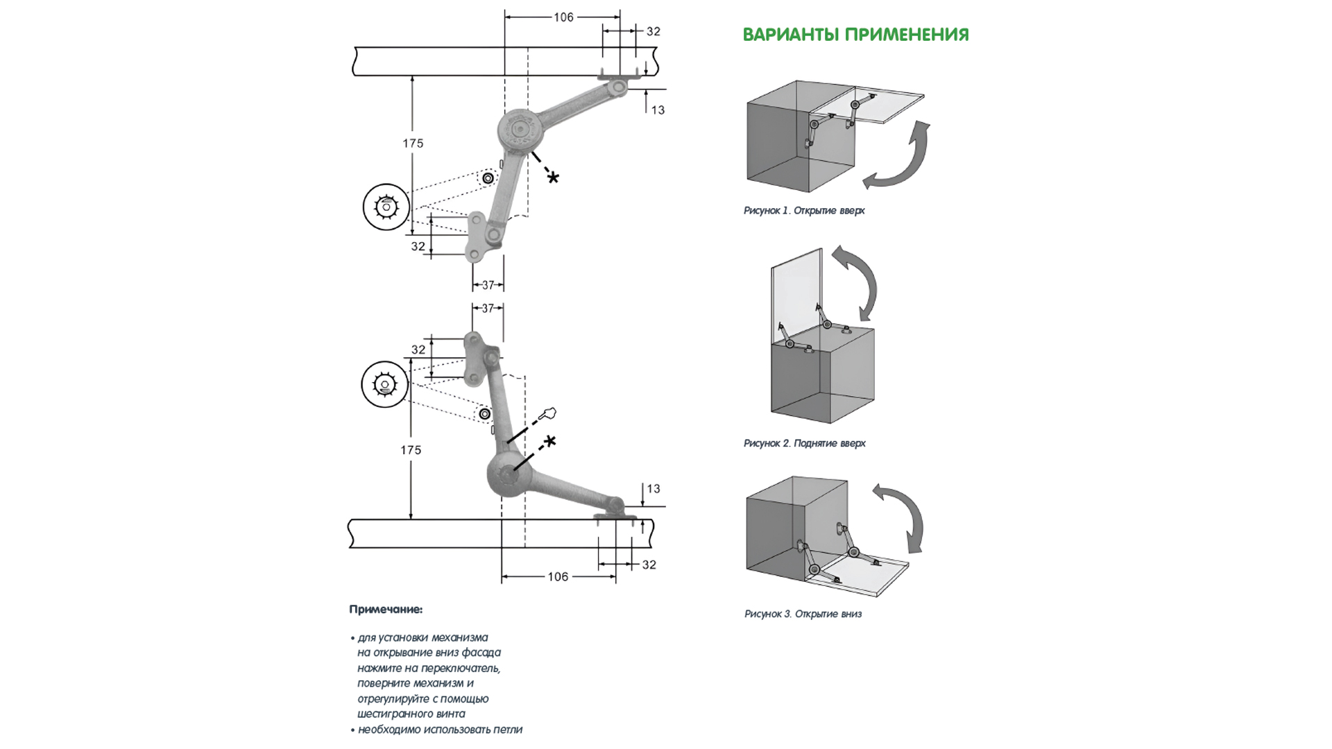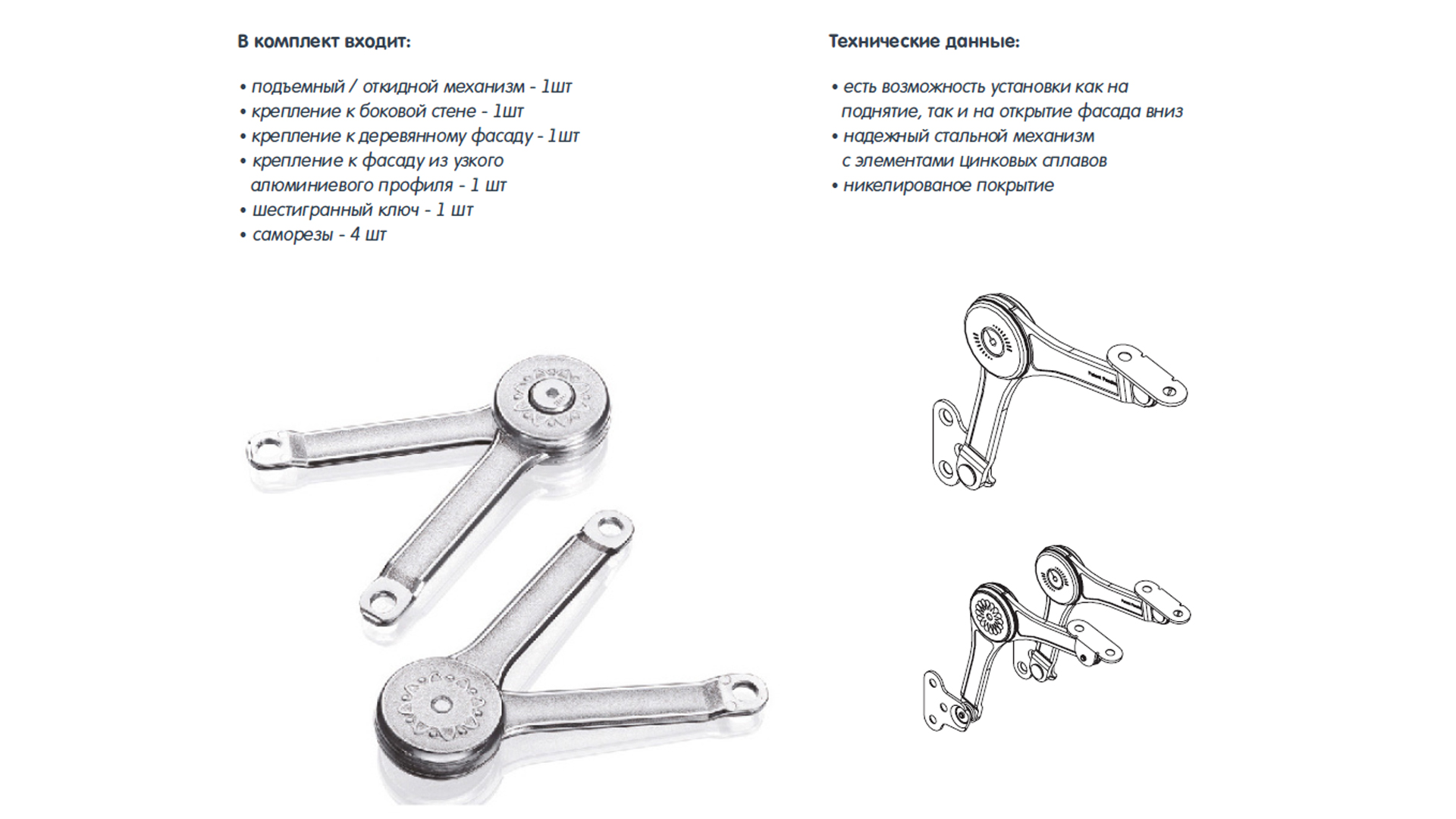 Бренд REGGAR Цвет Никель Материал Металл В комплект входит В комплект входит: подъемный/откидной механизм - 1шт; крепление к боковой стене - 1шт; крепление к деревянному фасаду - 1шт; крепление к фасаду из узкого алюминиевого профиля - 1 шт; шестигранный ключ - 1 шт; саморезы - 4 шт. Примечание В зависимости от веса и высоты фасада необходимо подобрать количество механизмов подъёма: один или два. См. таблицу. Страна КИТАЙ Вес нетто 0.4 Документы