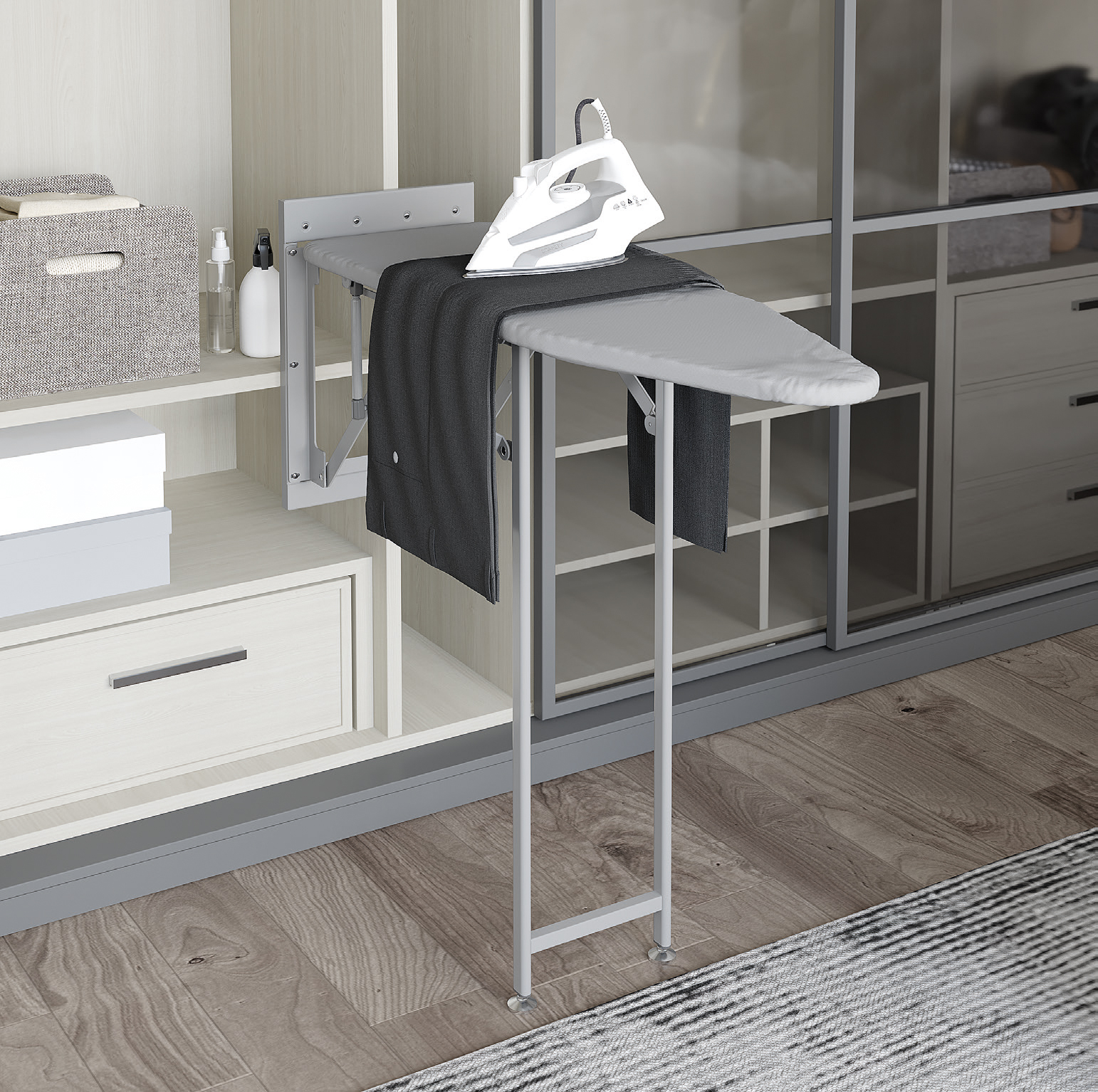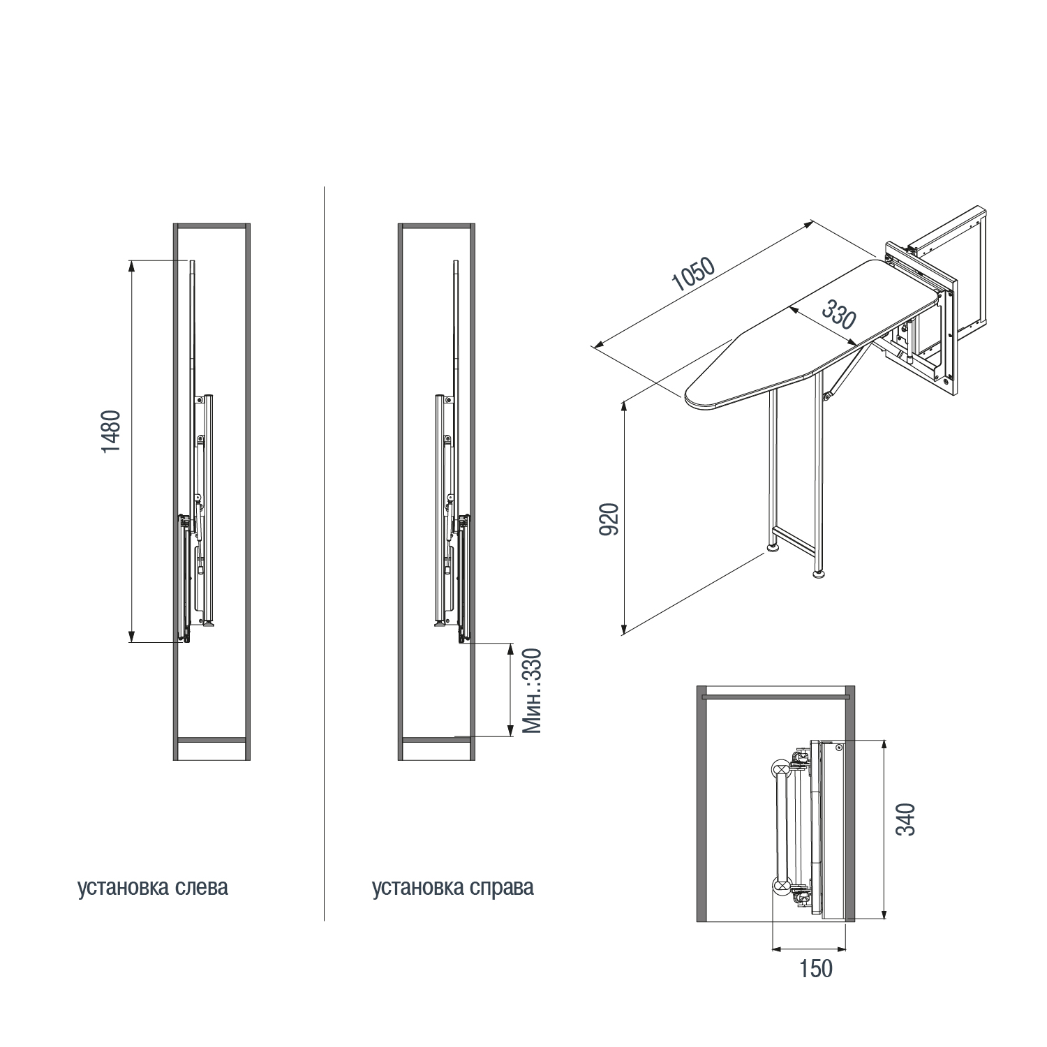 Поворотно-откидная гладильная доска с опорной рамой, 150х340х1480 мм, серый