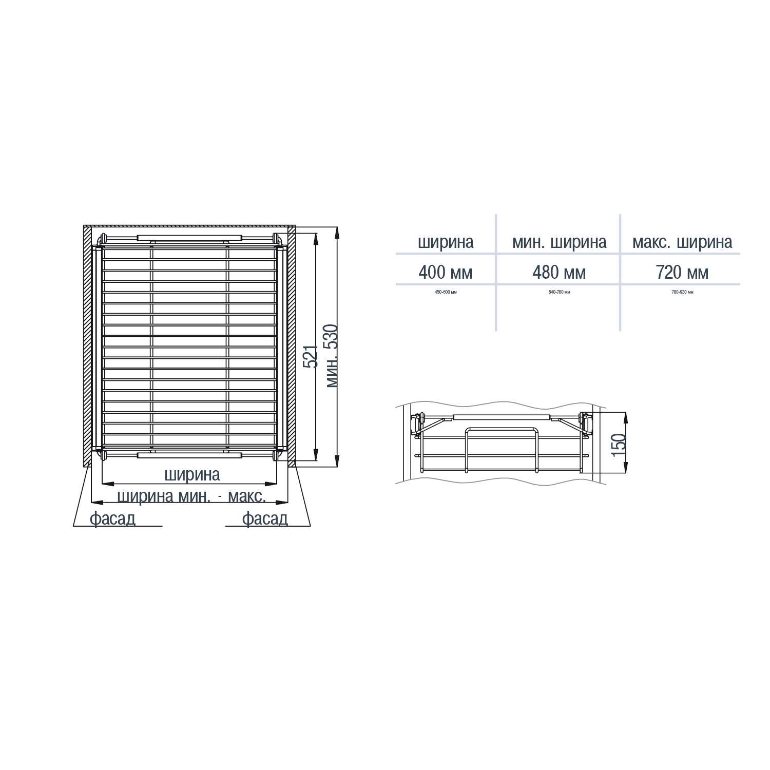 Решётчатая выкатная ёмкость для белья L=450-600мм с амортизатором, антрацит
