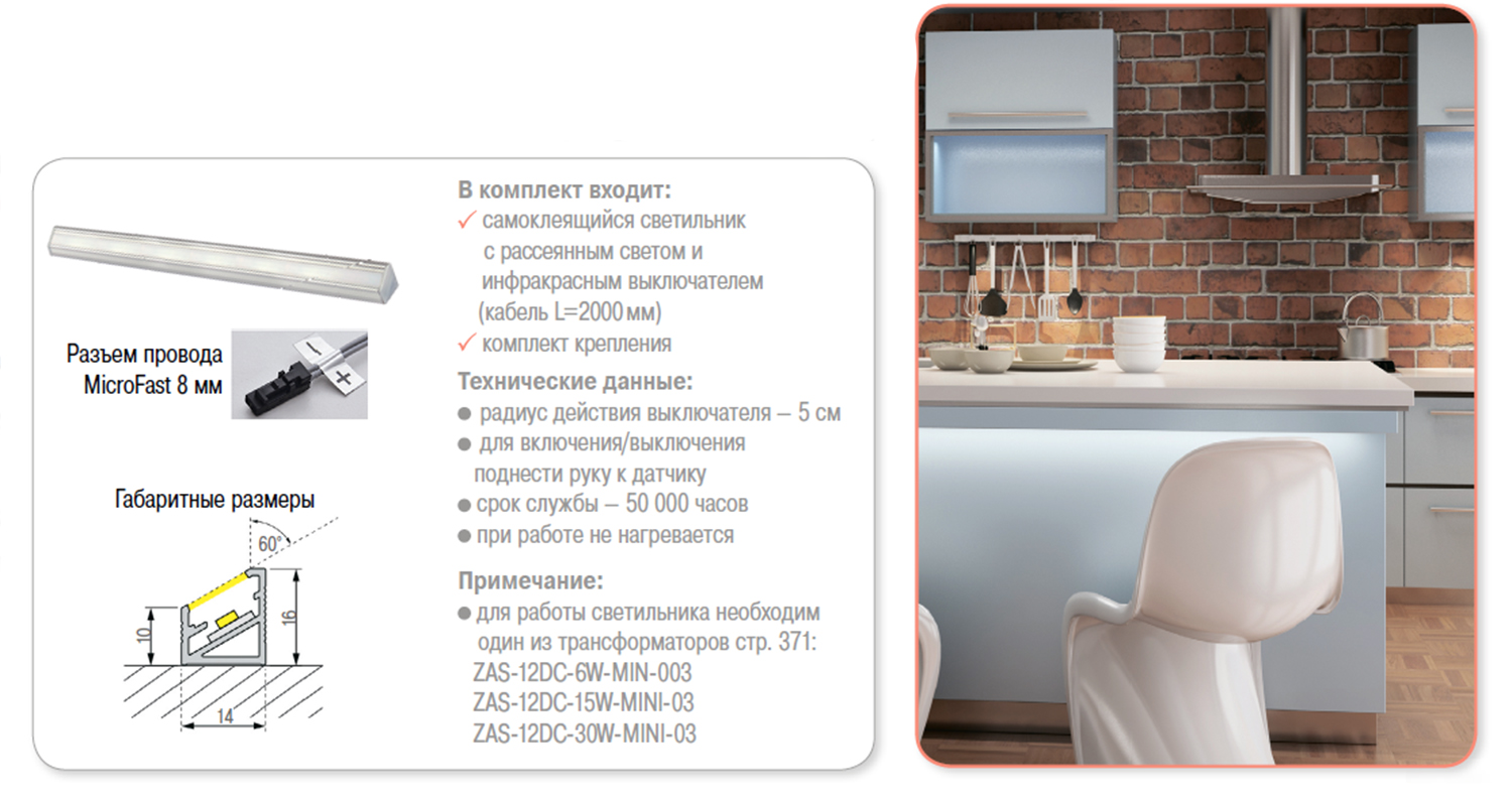 Бренд HLT (Польша) Цвет Алюминий В комплект входит Самоклеящийся светильник с рассеянным светом и инфракрасным выключателем (кабель L=2000мм),комплект крепления Технические данные Радиус действия выключателя — 5 см. Для включения/выключения поднести руку к датчику. Срок службы — 50 000 часов. При работе не нагревается. Примечание Для работы светильника необходим один из трансформаторов: ZAS-12DC-6W-MIN-003, ZAS-12DC-15W-MINI-03, ZAS-12DC-30W-MINI-03. Мощность, Вт 1,25 W Вес нетто 0.088