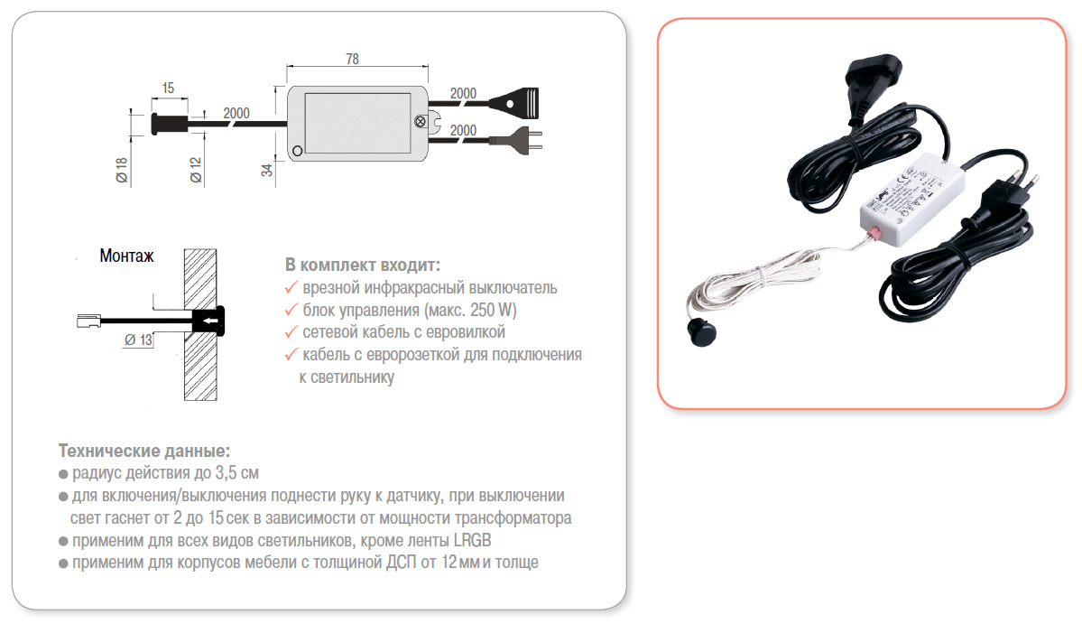 Бренд HLT (Польша) В комплект входит Врезной инфракрасный выключатель, блок управления (макс. 250 W), сетевой кабель c евровилкой, кабель с евророзеткой для подключения к светильнику. Технические данные Радиус действия до 3,5 см. Для включения/выключения поднести руку к датчику, при выключении свет гаснет от 2 до 15 сек в зависимости от мощности трансформатора. Применим для всех видов светильников, кроме ленты LRGB. Применим для корпусов мебели с толщино Мощность, Вт 250 W Вес нетто 0.226