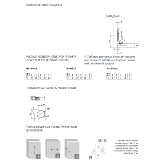 Бренд REGGAR В комплект входит - Петля со встроенным амортизатором - Ответная планка Технические данные - Используется для полунакладных фасадов; - Угол открытия 105гр; - Для фасадов толщиной 15-20 мм; - Глубина чашки 11,5 мм; - 3D-регулировки фасада; - Полностью металлическая конструкция; Крепление чашки Саморезы Страна КИТАЙ Амортизатор + Вес нетто 0.0896 -