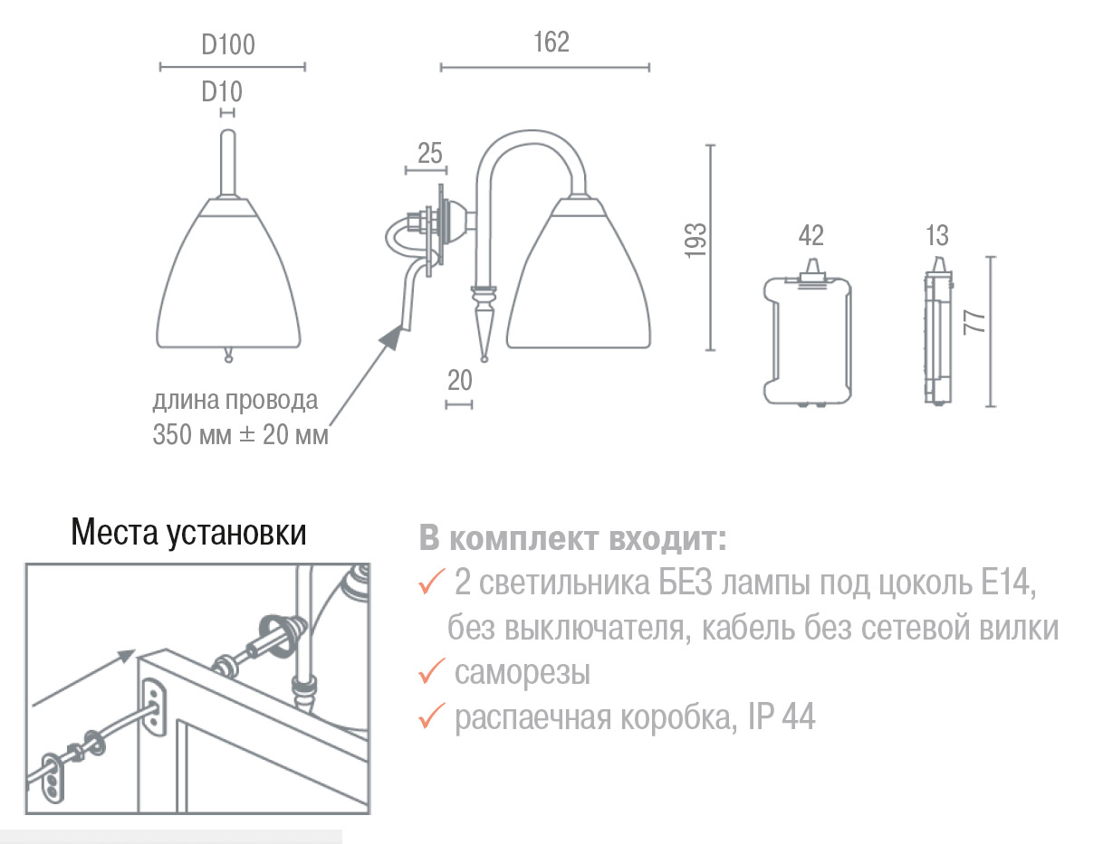 Бренд Ebir (Испания) Цвет Бронза В комплект входит 2 светильника БЕЗ лампы под цоколь Е14,без выключателя, кабель без сетевой вилки, саморезы, распаечная коробка, IP 44 Технические данные Двойная изоляция на всех токопроводящих деталях. Примечание Для работы необходимо соединить провода светильника через распаечную коробку c сетевым кабелем. Трансформатор не требуется. Страна ИСПАНИЯ Мощность, Вт 2x40W или 2x7W Вес нетто 0.918 -